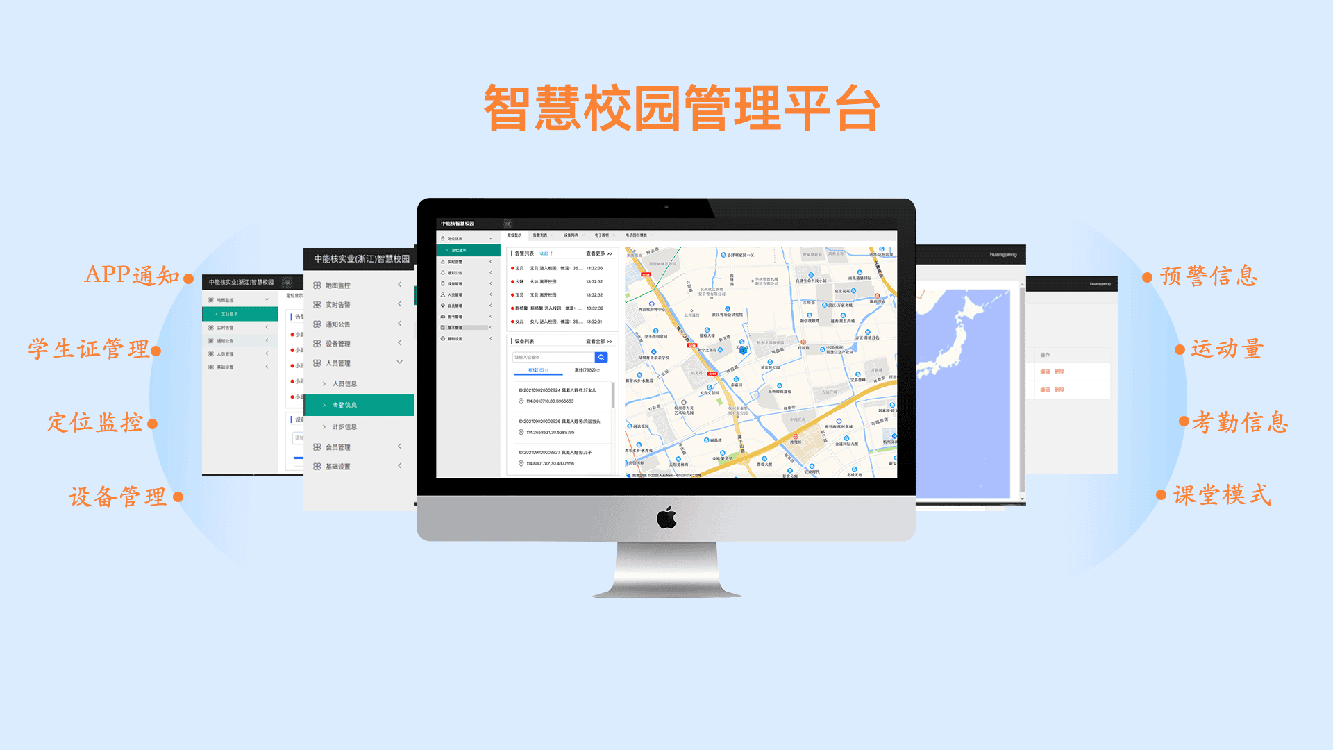 1.校长端:可以查看教职工/学生考勤信息、学生位置信息、学生一天的运动量、学生证预警信息、发送学校各类通知给家长等.