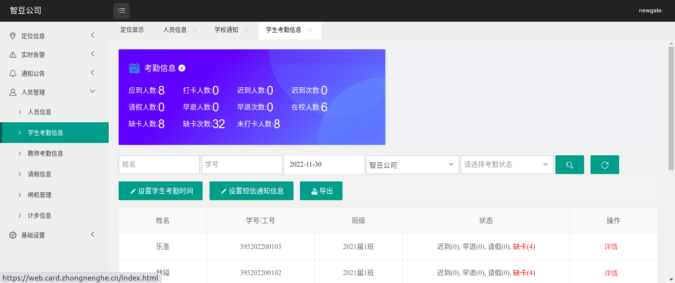 3.教务处端:可以查看学生考勤信息、学生位置信息、学生一天的运动量、学生证预警信息、设置课堂模式/休息模式、发送学校各类通知给家长等。